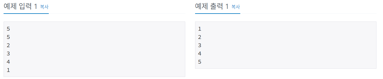 첫째 줄부터 N개의 줄에 오름차순으로 정렬한 결과를 한 줄에 하나씩 출력한다.