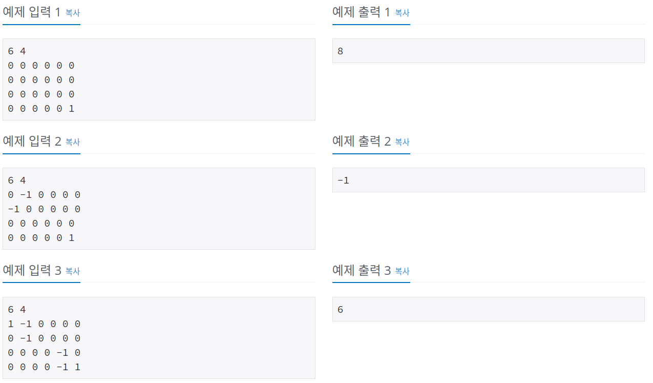 첫째 줄에 게임판에 있는 사다리의 수 N(1 ≤ N ≤ 15)과 뱀의 수 M(1 ≤ M ≤ 15)이 주어진다. 둘째 줄부터 N개의 줄에는 사다리의 정보를 의미하는 x, y (x < y)가 주어진다. x번 칸에 도착하면, y번 칸으